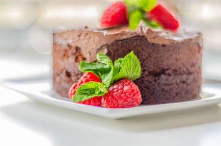 Gluten free tasty round cake based on Belgian chocolate decorated with fresh raspberries and mint, delicious sweets