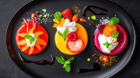 A vibrant display of mini desserts topped with fresh fruits and cream, elegantly presented on a stylish plate, perfect for a culinary showcase.