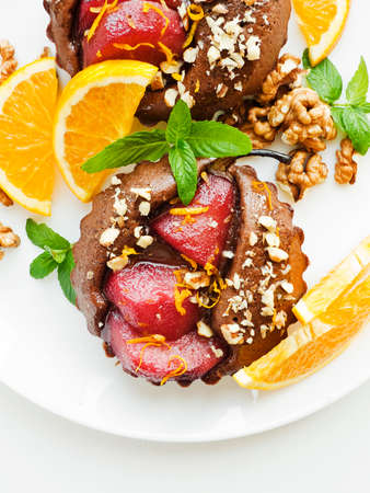 Christmas dessert mulled pear mini cakes with oranges and nuts. Shallow dof.