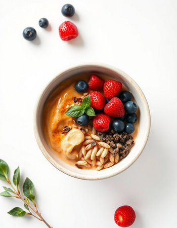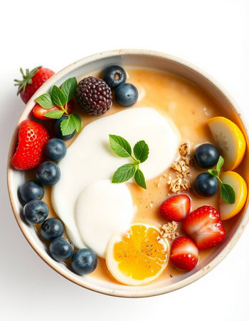 A beautifully arranged gourmet dessert features a creamy base topped with vibrant fruits and garnished with edible flowers. This artistic presentation showcases culinary creativity.