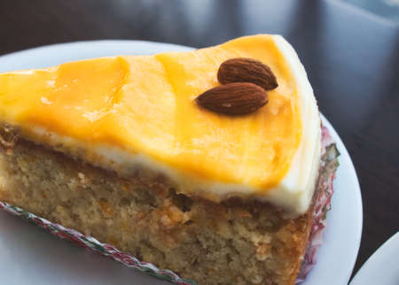 Close-up of a slice of carrot cake with orange icing and almonds on top