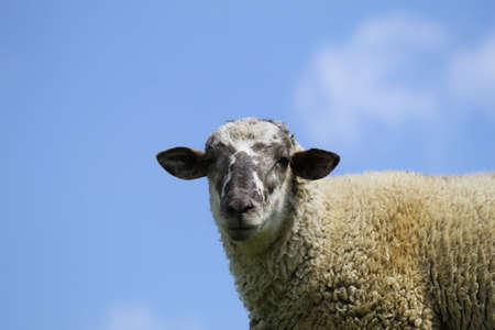 Close face of sheep standing in green meadow are four-legged ruminant mammals, typically kept as livestock, Lamb in the field in the countryside.