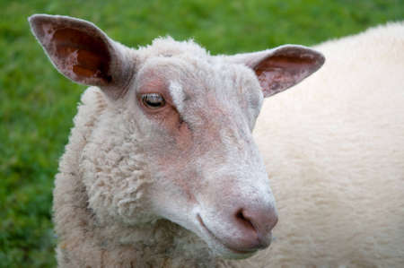 Sheep grazing on a green grass, head closeup. A lamb head portraiture on a grass field.