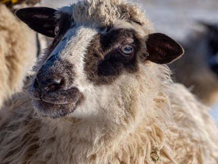 Sad kulunda breeding sheep. Muzzle sharing. Meat and fur farm production. Animal head. Closeup portrait staring.