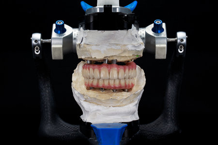 Dendal Articulator with ceramics and titanium prostheses in a bite on a black background