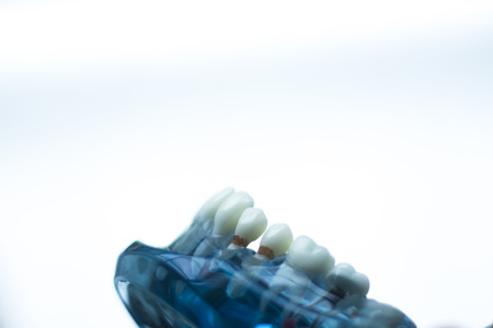 The dental model is used to teach how to check the cleanliness of the teeth by the doctor. Blue background .