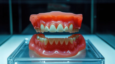 Symmetrical macro view of false teeth and gum ridge resting on tray under bright lighting