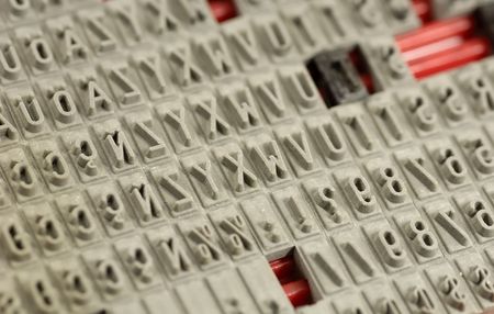 Old lead ink printing type from a book printing company. Historical metal letters from an old printing machine.
