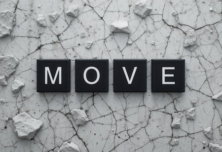 A striking visual representation of the word MOVE using bold black tiles on a cracked white surface, symbolizing change, progress, and inspiration in designs.