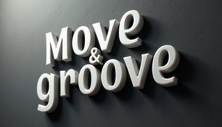 The image features bold, three-dimensional lettering that reads Move Groove, set against a sleek, dark textured wall. This vibrant design captures the essence of energy and rhythm, inviting viewers to embrace movement and creativity.