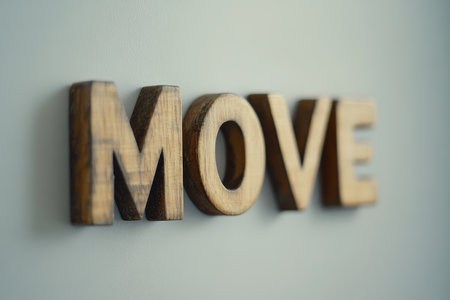 Wooden letters arranged to form the word move are mounted on a softly colored wall. The blurred effect adds a sense of motion to the overall design, creating a focal point in a serene environment.