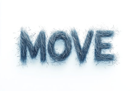 Soft fibers form the word Move in a blurred style, emphasizing movement and dynamics. The design features a clean, white background that enhances the texts visual impact.