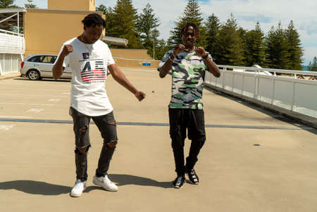 Side view of young couple doing warm up exercise outdoors on terrace, sport and healthy lifestyle concept.