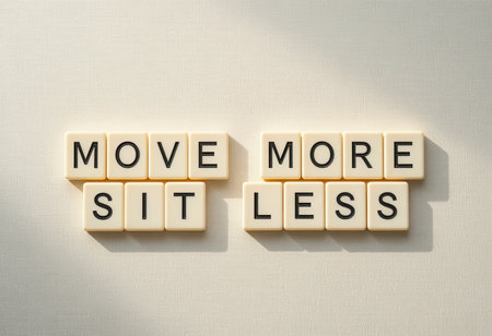Inspiring text arrangement promoting an active lifestyle with a focus on moving more and sitting less. Perfect for health and fitness themes.