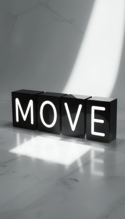 A stylish lightbox displaying the word Move in a bright and minimalistic design. This image captures a modern ambiance perfect for inspiring motivation in various settings.