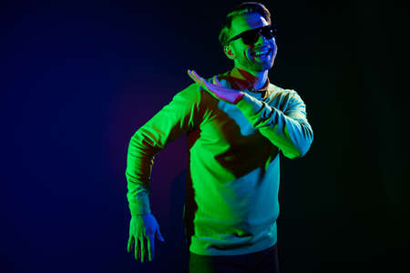 Hipster dancer fashion professional man in fashionable clothes dancing in creative colorful studio with pink and blue light