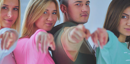 Business people team pointing with index fingers at you closeup