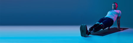 Confident man in sport uniform with prosthetic legs doing plank in horizontal position in neon light on floor. Motivation poster. Concept of sport for people with disabilities, medical, health. banner