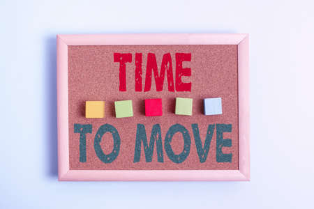 Text showing inspiration Time To Move. Business showcase change in the same way or to reflect on what is current Stack of Sample Cube Rectangular Boxes On Surface Polished With Multi-Colour
