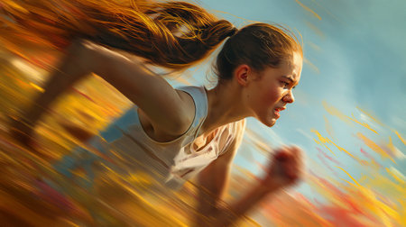 An action-packed scene of a runner sprinting down a track, with dynamic motion blur to convey speed