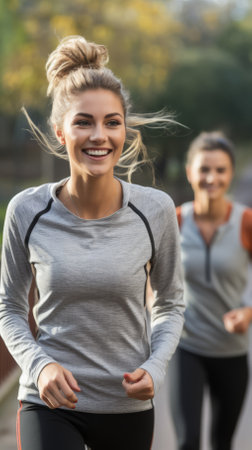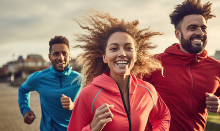 Group of young people in sports clothing jogging together outdoors. AI Generated.