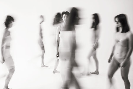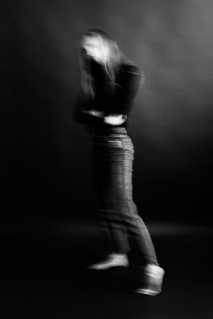 This striking image captures the essence of shifting identities using motion blur to convey the complexities of self perception and the passage of time.