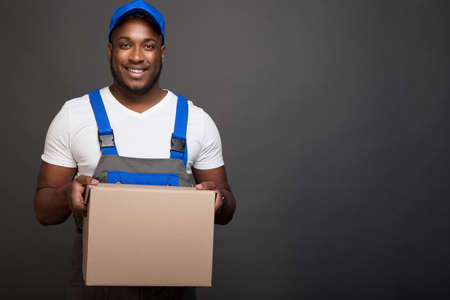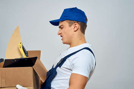 Dark-skinned guy in a white T-shirt overalls and a blue cap holds a cardboard box of tools in front of him. A cheerful dark-skinned man easily holds a heavy cardboard box in his hands