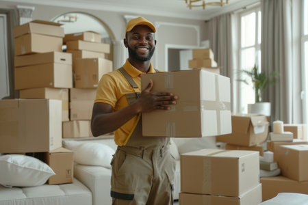 Happy Moving Day Smiling Mover in Uniform Holds Cardboard Box, Surrounded by Packed Belongings