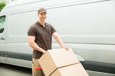 Young Delivery Man Holding Trolley With Cardboard Boxes