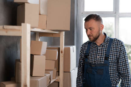 Young man dressed in blue overalls near cardboard boxes in a warehouse. Work in a logistics company.