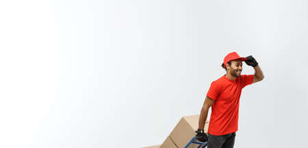 Delivery Concept - Portrait of Handsome African American delivery man or courier pushing hand truck with stack of boxes. Isolated on Grey studio Background. Copy Space.