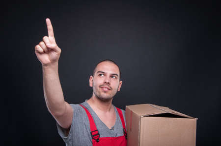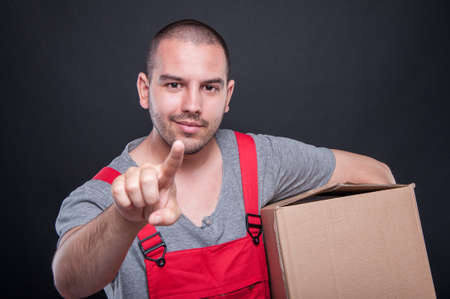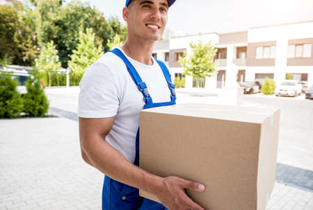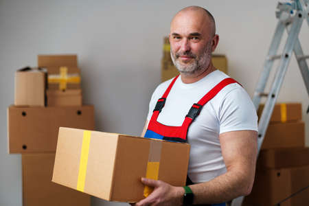 Middle-aged man mover in uniform holding cardboard box, portrait