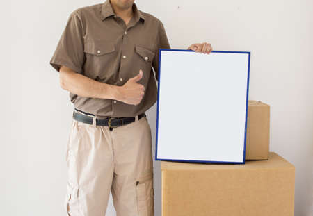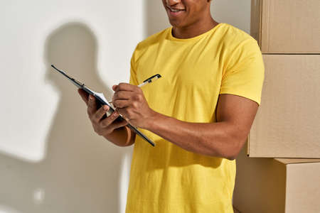 Cropped shot of professional male mover in yellow t shirt making notes, holding clipboard, standing near a stack of cardboard boxes while doing home relocation