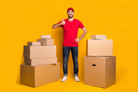 Full length body size photo smiling courier with carton boxes showing like thumb-up sign isolated on vivid yellow color background