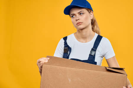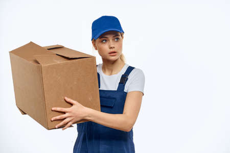 A woman in a working uniform with a box in the hands of a delivery service delivery service light background