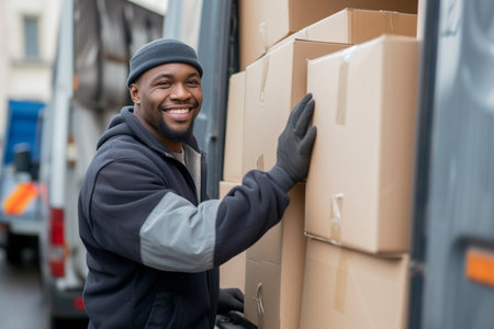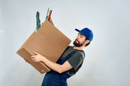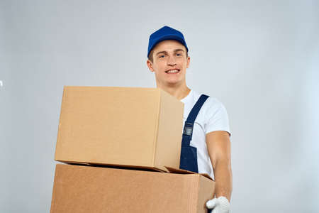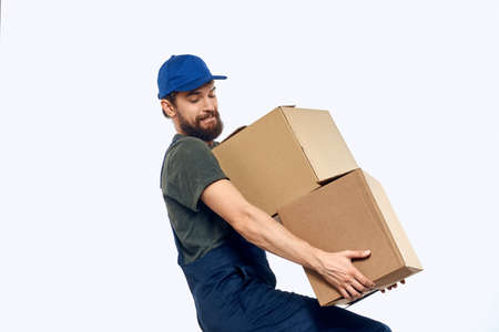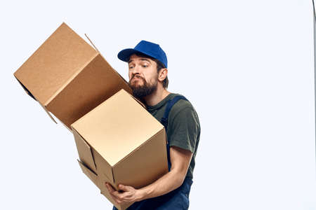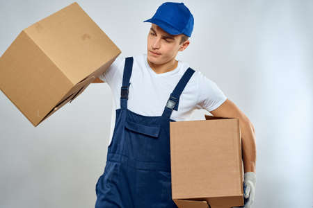 Man in working uniform with boxes in hands delivery loading lifestyle
