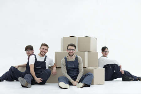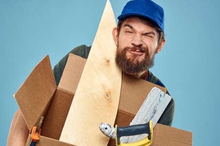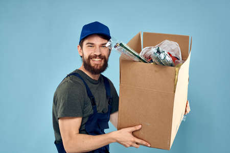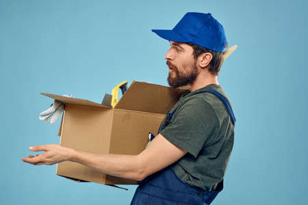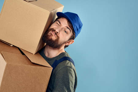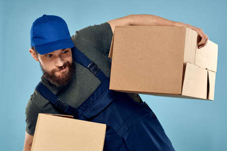 A man in working uniform with boxes in the hands of a carriage delivery service blue background
