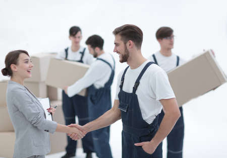 Day moving. Delivery of goods from shopping in the online store. The loader or courier shows the muscles against the gray wall.