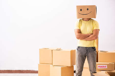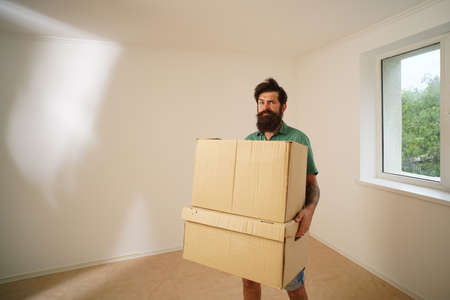 Moving to a new apartment. Young man holding a cardboard boxes. Box, Moving House,