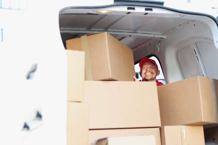 Portrait Of A Mover In Uniform Arranging The Moving Cardboard Boxes Inside The Van