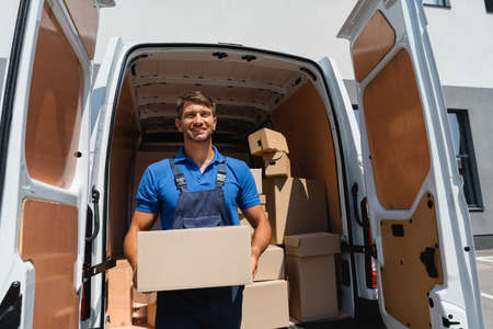 Portrait Of A Smiling Mover In Uniform Loading A Cardboard Boxes In A Moving Van