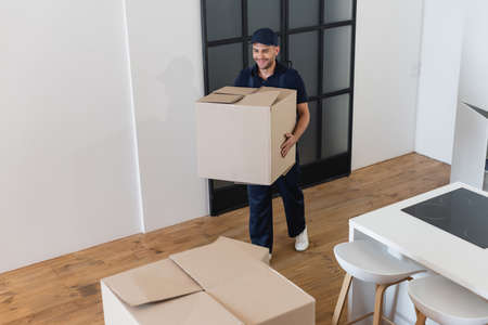 Smiling young male deliveryman or mover hold cardboard box pack belongings in client office or home. Happy man worker from removal or deliver company unload packages. Moving and relocation.