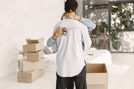 Moving day, new home, unpacking boxes. Happy couple in their new apartment is having fun with cardboard boxes. Cheerful young couple in new house at moving day