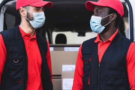 Young delivery men working while wearing face mask to avoid virus spread - People working with fast deliver during virus outbreak