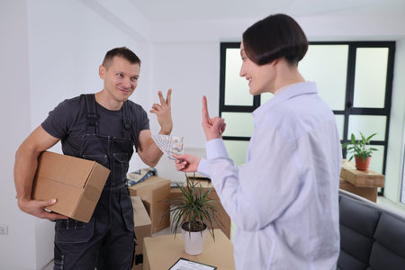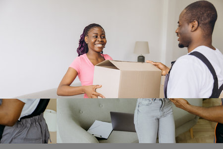 Smiling african american woman receiving cardboard box from male mover, delivering belongings to new home