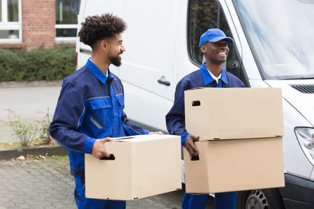 Close-up Of Two Delivery Men Holding The Cardboard Boxes