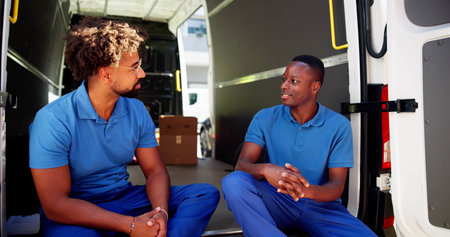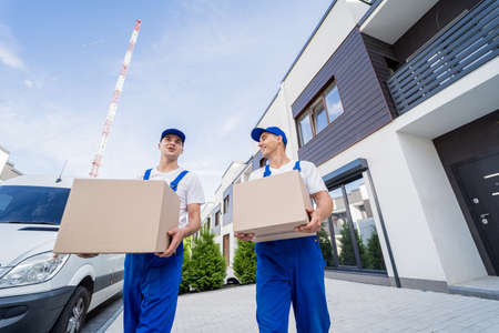 Workers unloading boxes from van outdoors. Moving service and customer need for move to new house