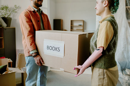 Young adult man and young adult woman with prosthetic arm carrying cardboard box labeled books while moving and doing renovations in unfurnished room