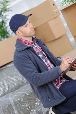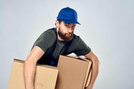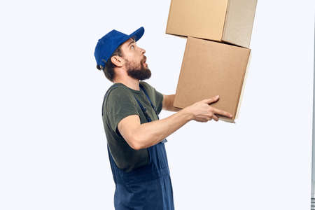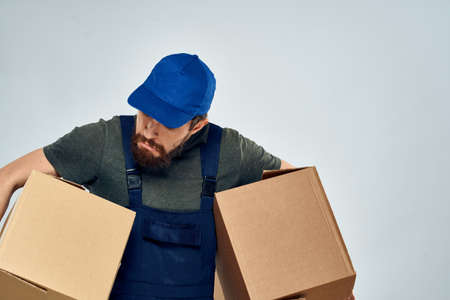 Man in working uniform with boxes in hands delivery loading lifestyle