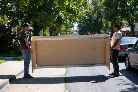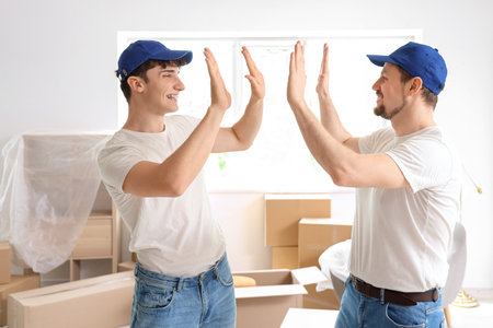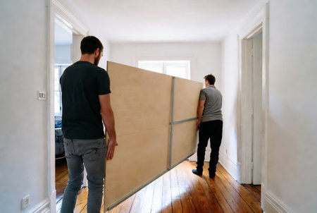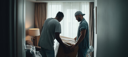 Two young male movers carefully lifting and carrying a large, heavy cardboard box into a new apartment, showcasing teamwork and professionalism